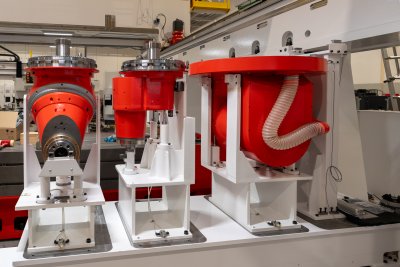 Cabezales de fresado suministrados: desde la izquierda, cabezal universal birrotativo, cabezal vertical con husillo descentrado y cabezal en horquilla con sistema de aspiración.