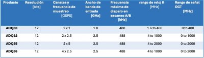 Tabla 2. Valores de rendimiento seleccionados para varios digitalizadores de la serie ADQ3.